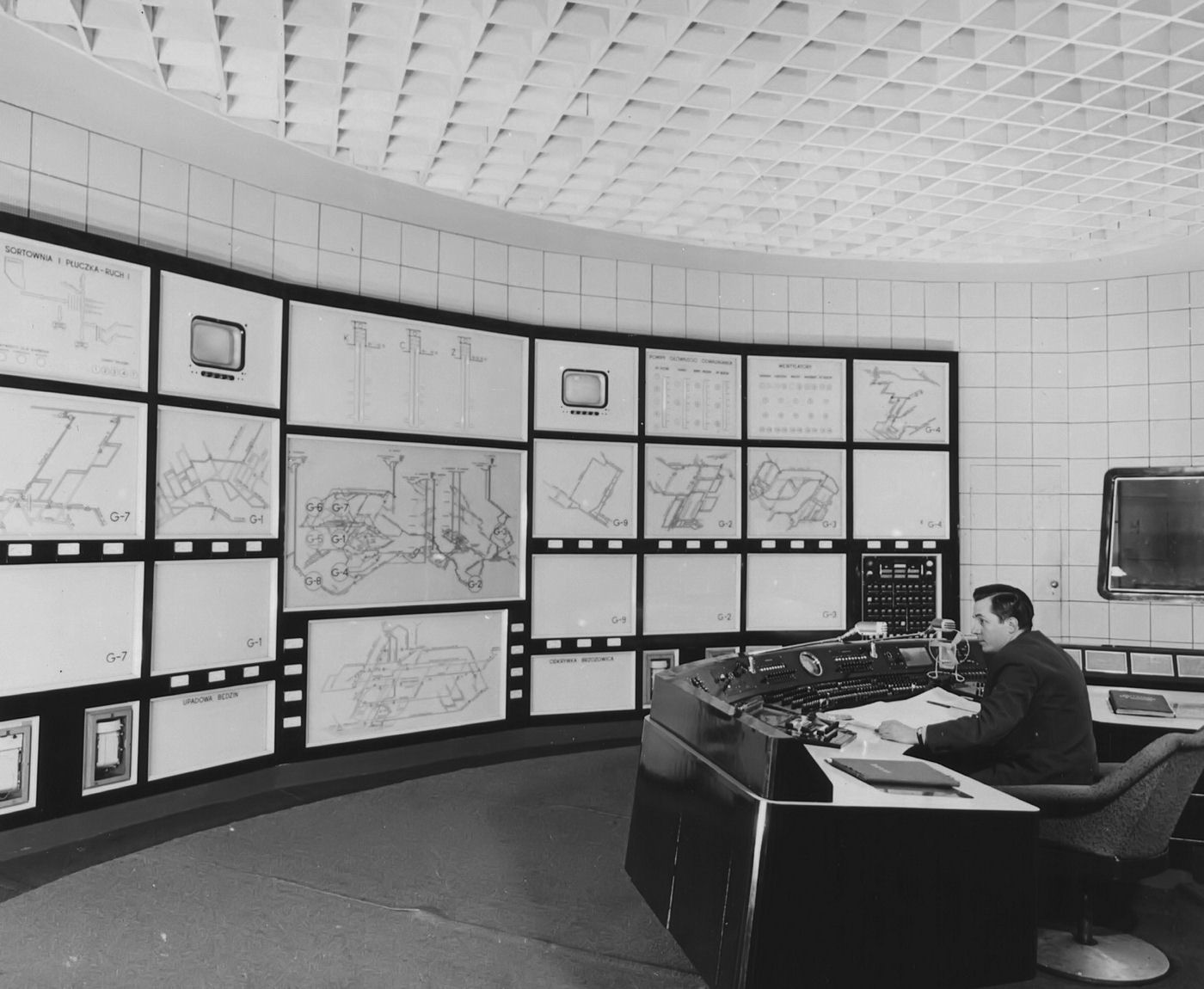 - części tablicowej - pokazującej na wielkim schemacie kopalni, pracę szybów, pracę transportu i stan czujników bezpieczeństwa.