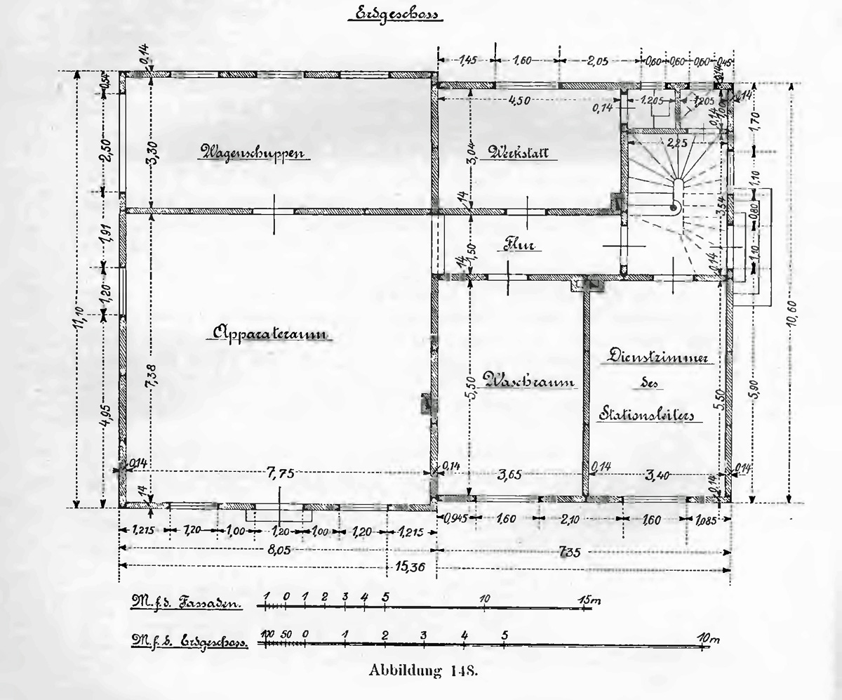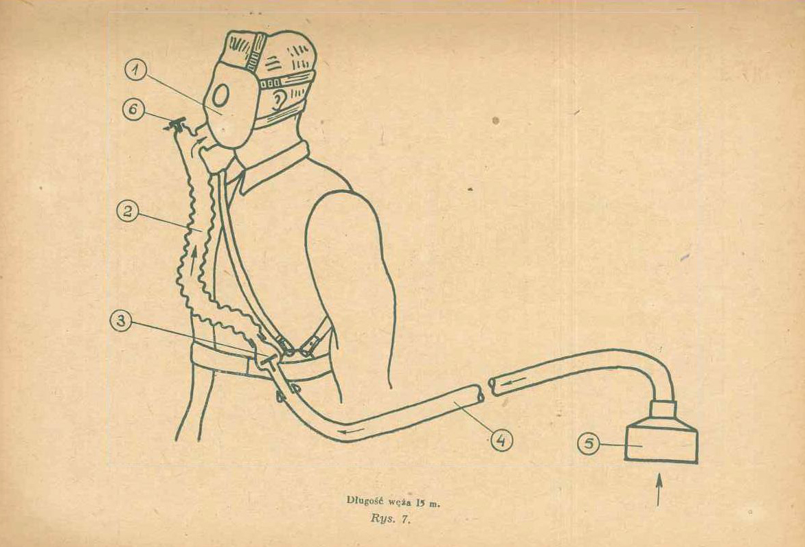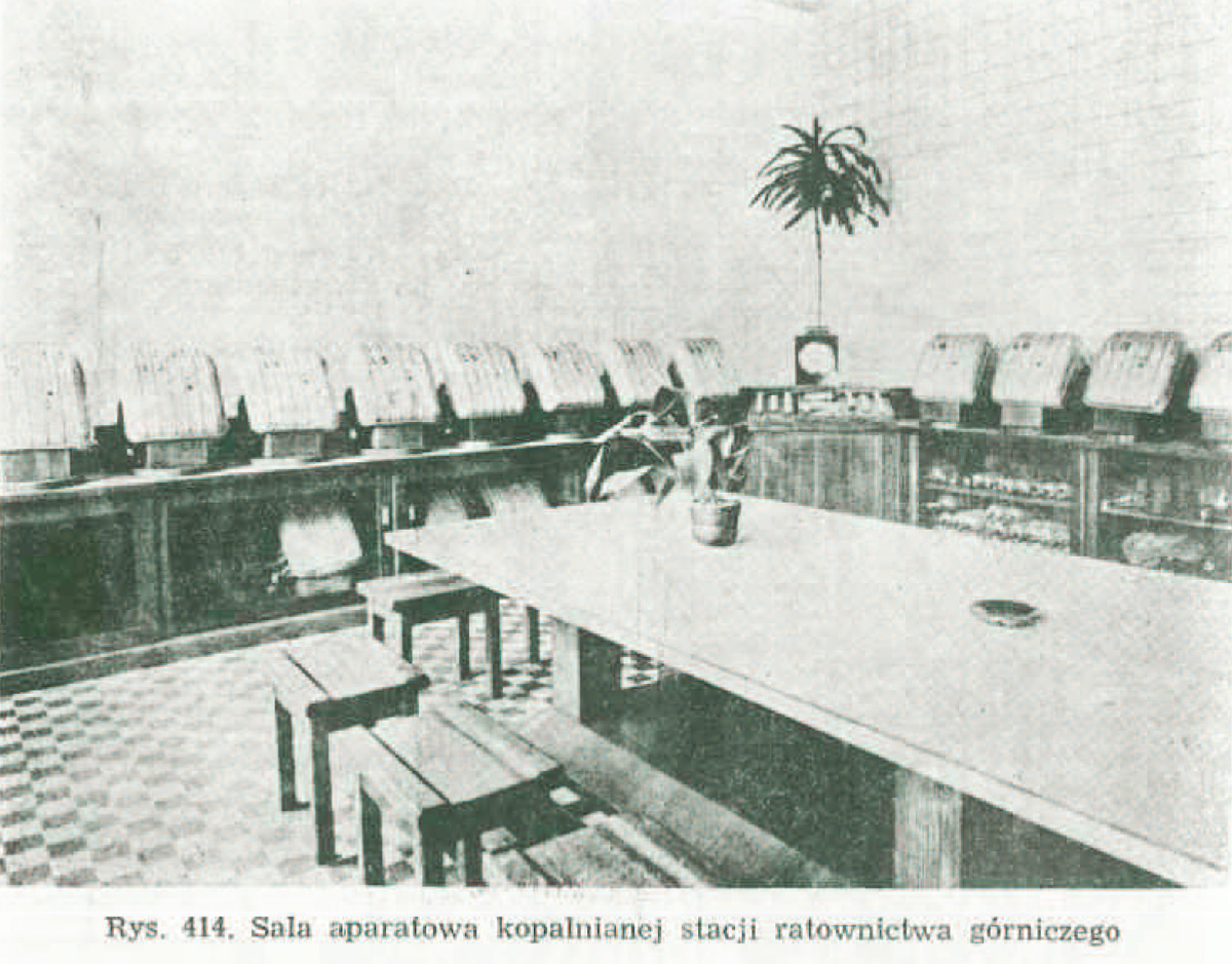 "Stacja ratownicza kopalni (rys. 414) jest to pomieszenie do przechowywania odpowiedniej liczby aparatów oddechowych i materiałów niezbędnych do wszczęcia w razie potrzeby akcji ratowniczej. Aparaty oddechowe w stacji ratowniczej powinny być zawsze w całkowitej sprawności i gotowości do natychmiastowego użycia. Toteż aparaty te są stale kontrolowane na szczelność, a w razie zauważenia najmniejszych braków, uszkodzone części zastępuje się nowymi z podręcznego magazynu stacji. Stacja ratownicza wyposażona jest ponadto we wszelkie narzędzia nieodzowne do akcji. Narzędzia te powinny znajdować się we wzorowym porządku i być umieszczone w miejscach widocznych i łatwo dostępnych.